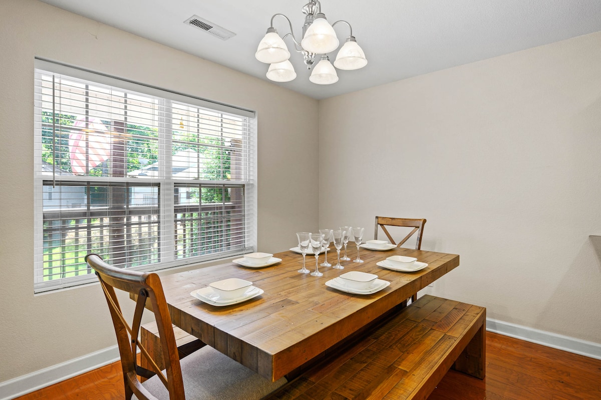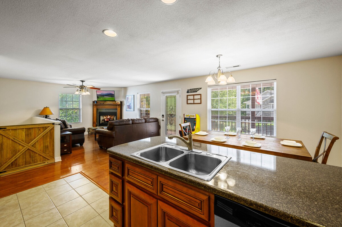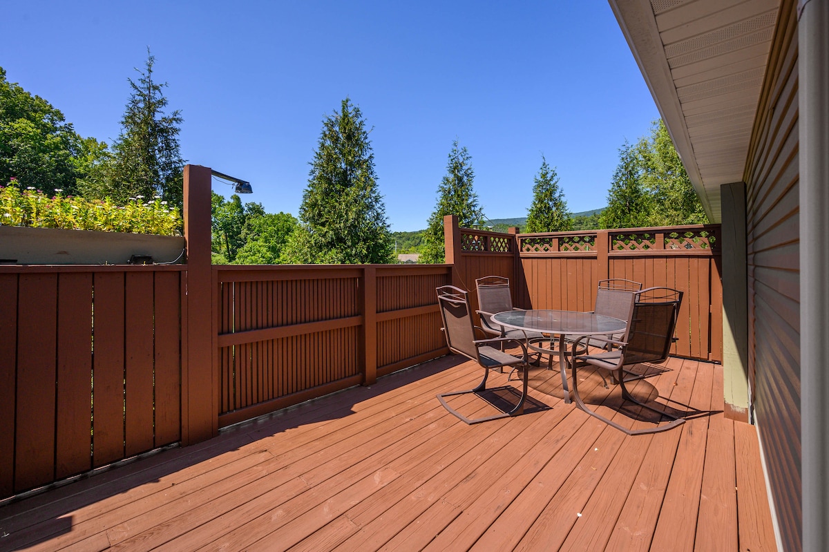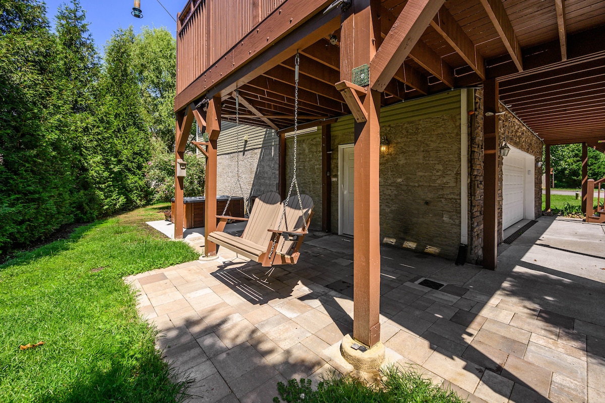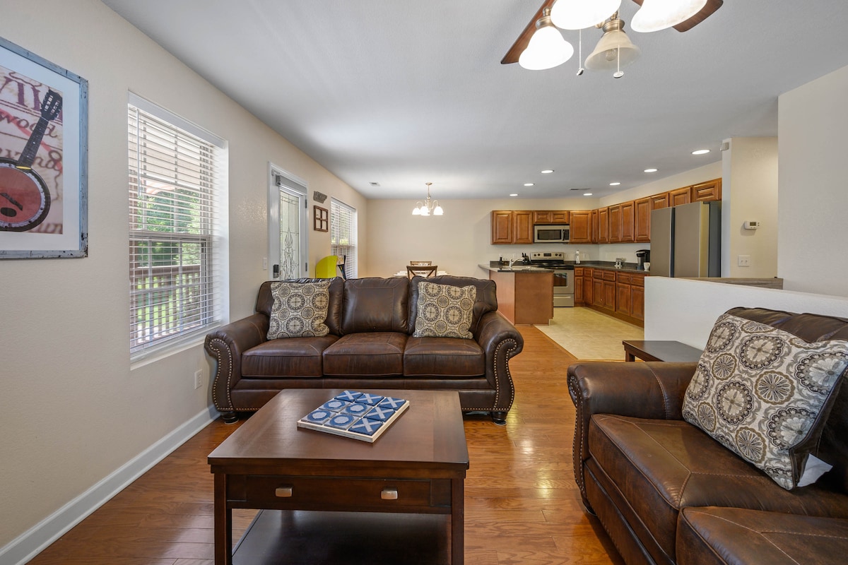 The kitchen is spacious and stocked with everything you need to prepare a family meal. Trees around the property give excellent privacy while you relax in the hot tub or swing peacefully.