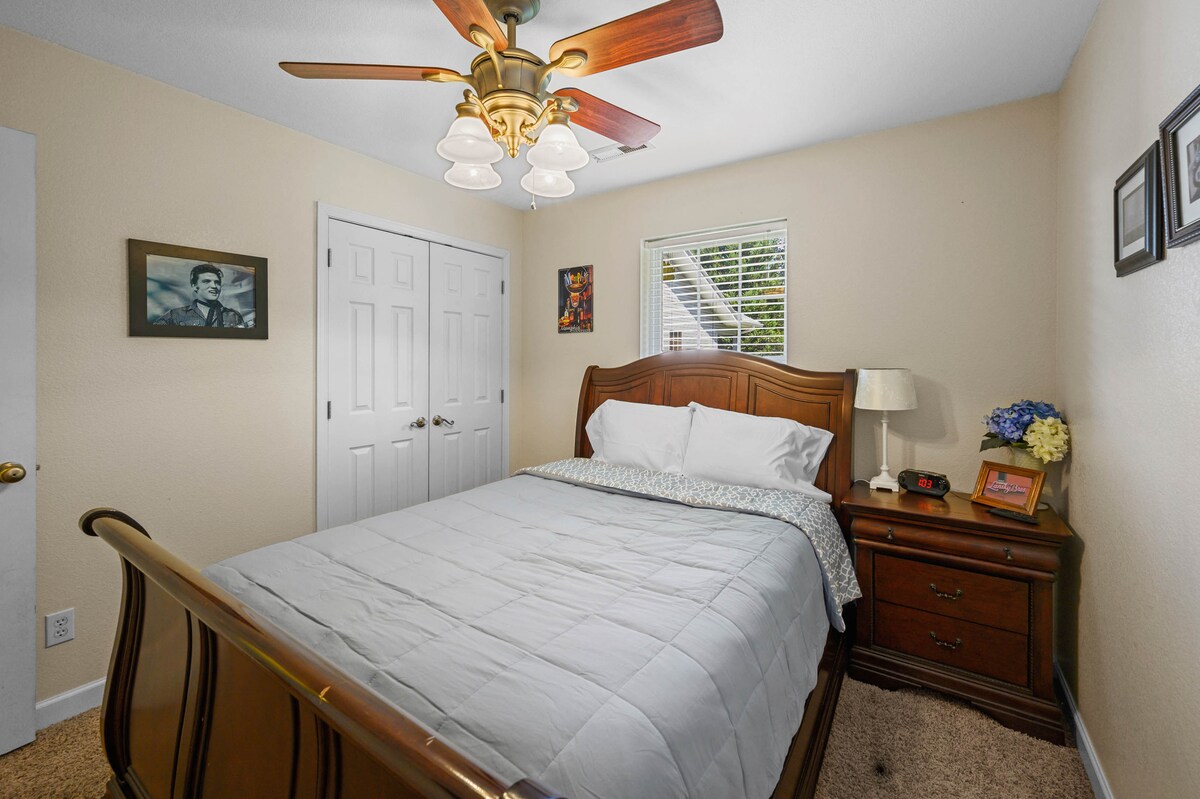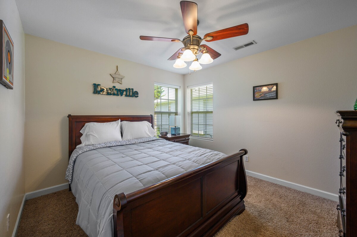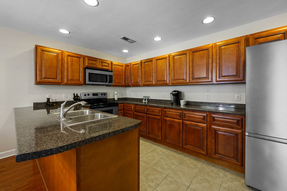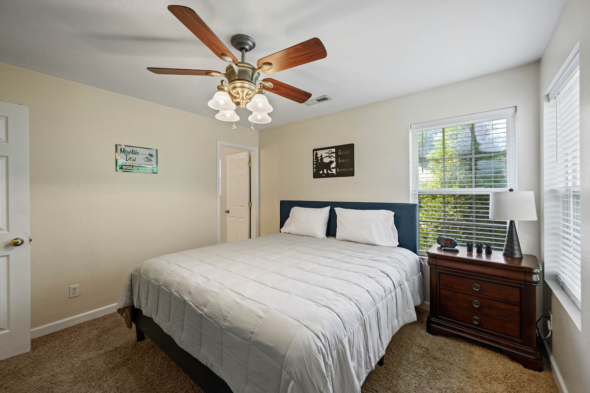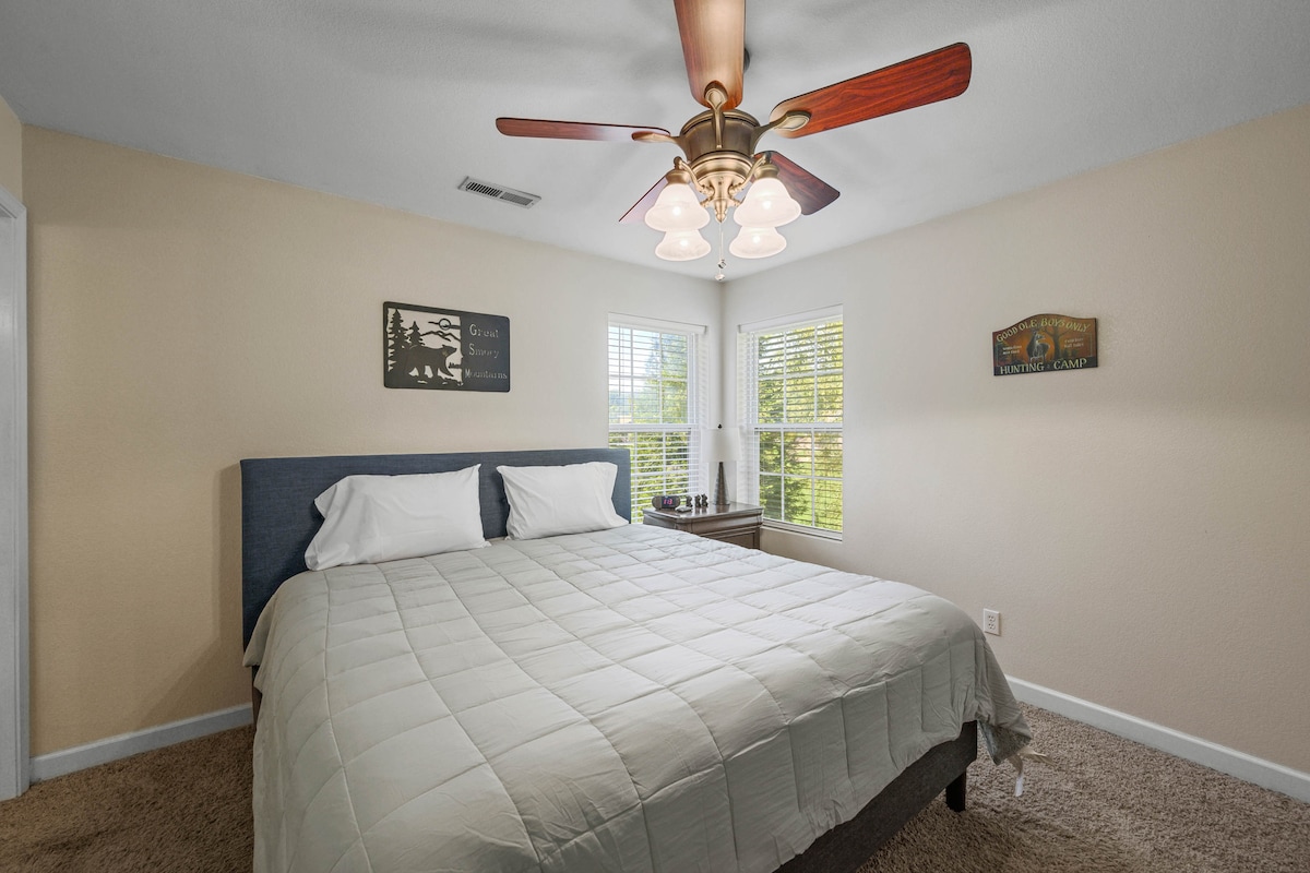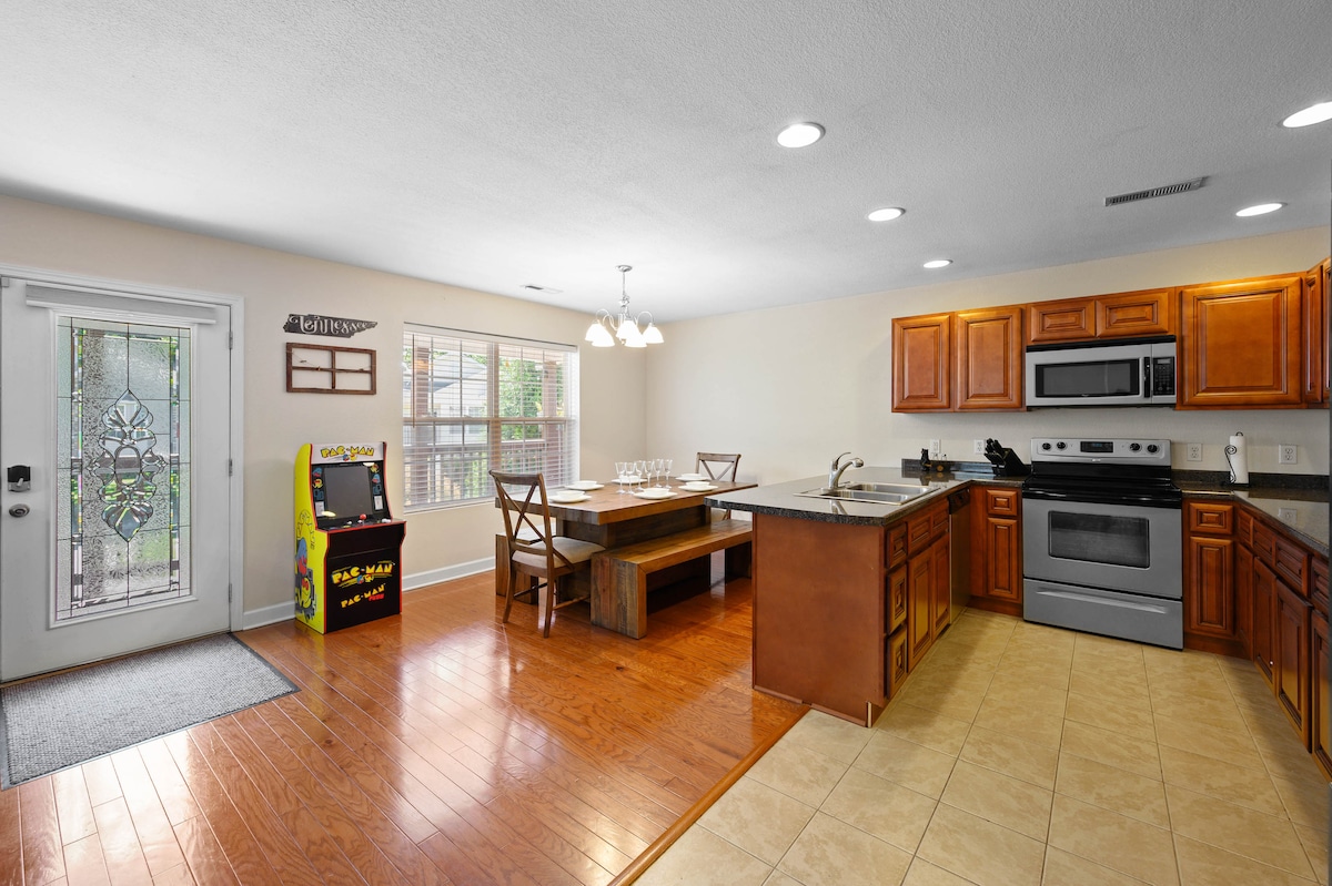 The kitchen is spacious and stocked with everything you need to prepare a family meal. Trees around the property give excellent privacy while you relax in the hot tub or swing peacefully.